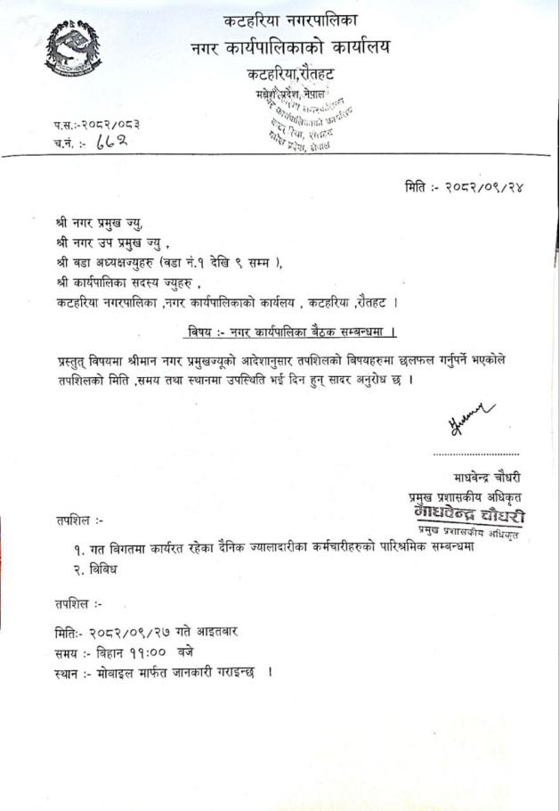 नगर कार्यपालिका बैठक सम्बन्धमा !