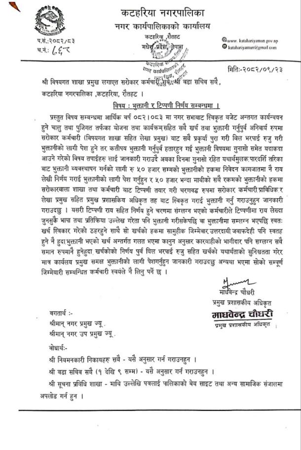 कटहरिया नगरपालिका नगर कार्यपालिकाकाे कार्यालय