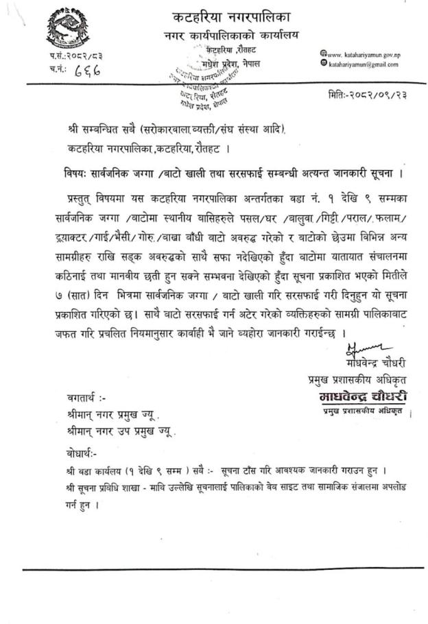 सार्वजनिक जग्गा /बाटो खाली तथा सरसफाई सम्बन्धी अत्यन्त जानकारी सूचना !