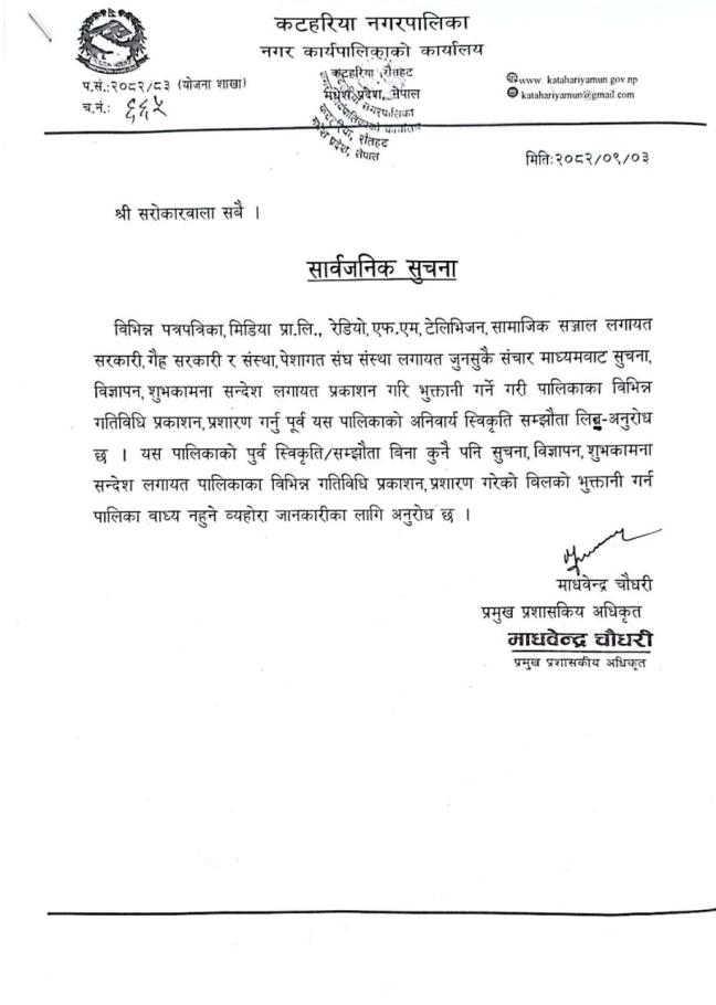 बजार ठेक्का सम्बन्धी कटहरिया नगरपालिकाको सूचना (प्रथम पटक प्रकाशित मिति -२०८१।०७।११)