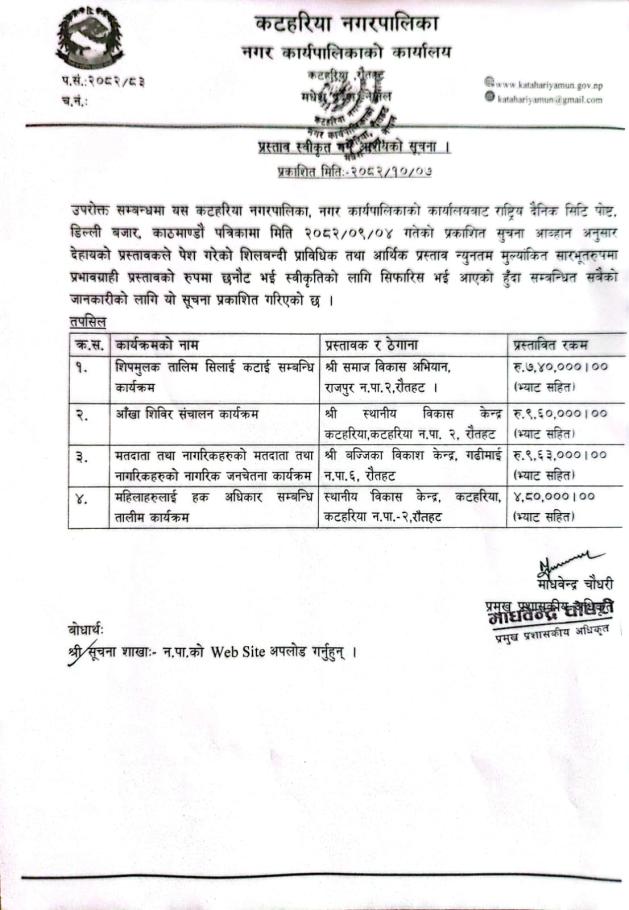 बजार ठेक्का सम्बन्धी कटहरिया नगरपालिकाको सूचना (प्रथम पटक प्रकाशित मिति -२०८१।०७।११)