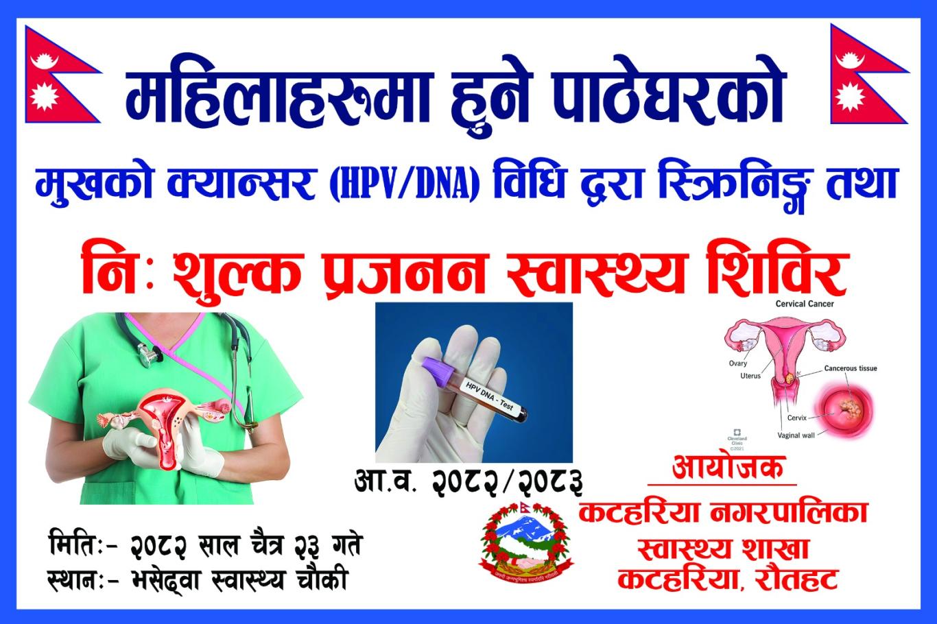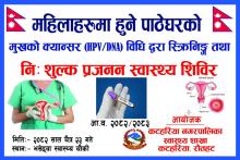 महुलाहरुमा हुने पाठेघरको मुखको क्यान्सर (HPV/DNA) विधि द्धारा स्क्रिनिङ्ग तथा निशुल्क प्रजनन स्वास्थ्य शिविर ।