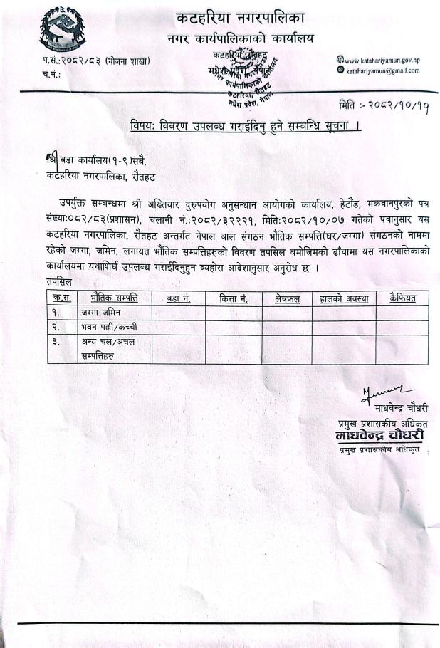 कटहरिया नगरपालिका नगर कार्यपालिकाकाे कार्यालय